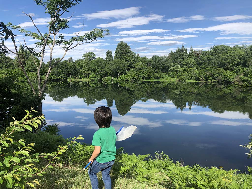 空に浮かぶ雲と木々が鏡のように澄んだ水面にくっきりと映った景色がとても素晴らしです。そこに虫取り網を持った子どもが映りこんでいることで、さらに季節感や雰囲気を盛り上げているとても良い作品です。