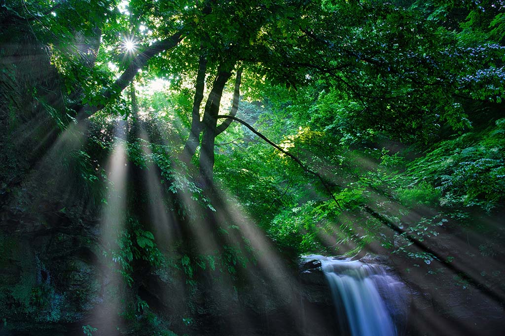 うっそうと茂る木々の間から差し込む木漏れ日とその隣の滝から流れ落ちる水の躍動感をうまく捉え、初夏の雰囲気を表現したよい作品です。撮影者の技術の高さも伺えます。